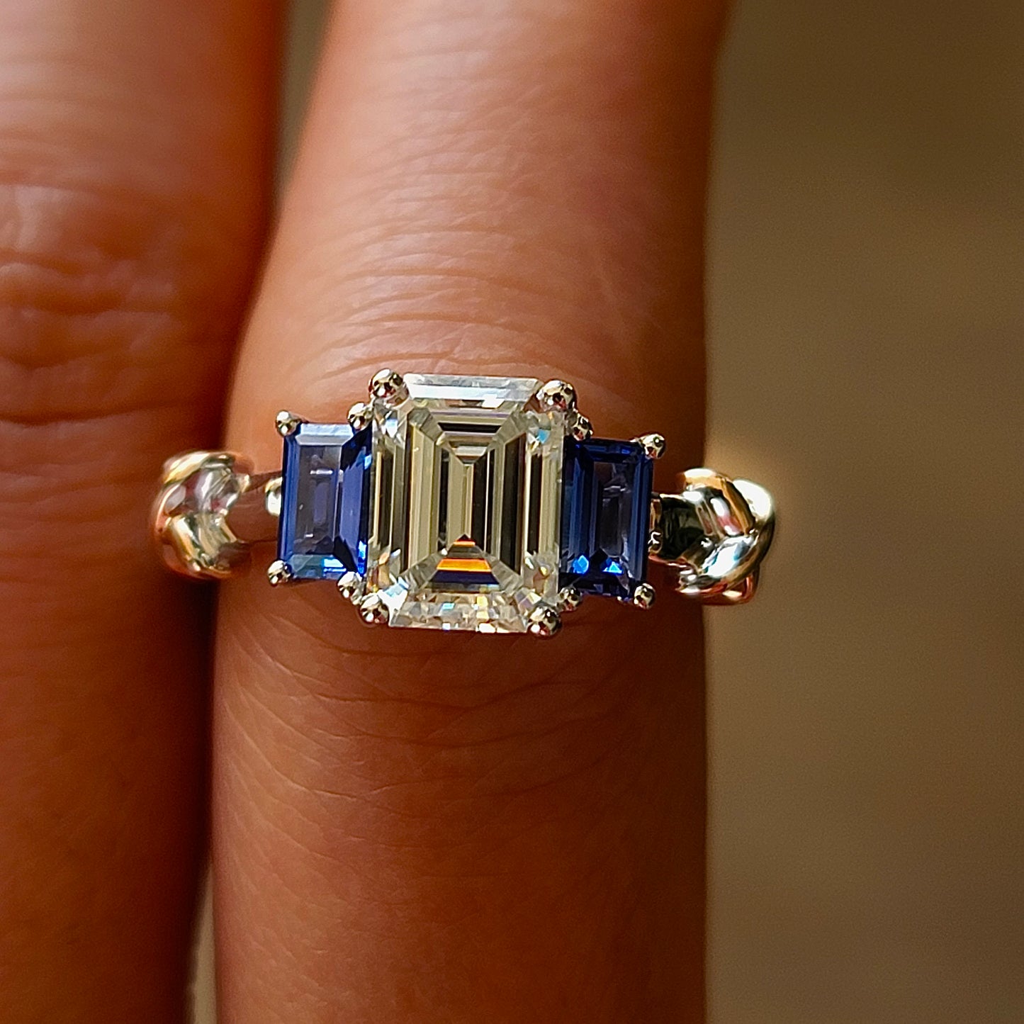 Accents: 2 pieces of 0.5ct(3*5mm), emerald shape, intense royal blue sapphire