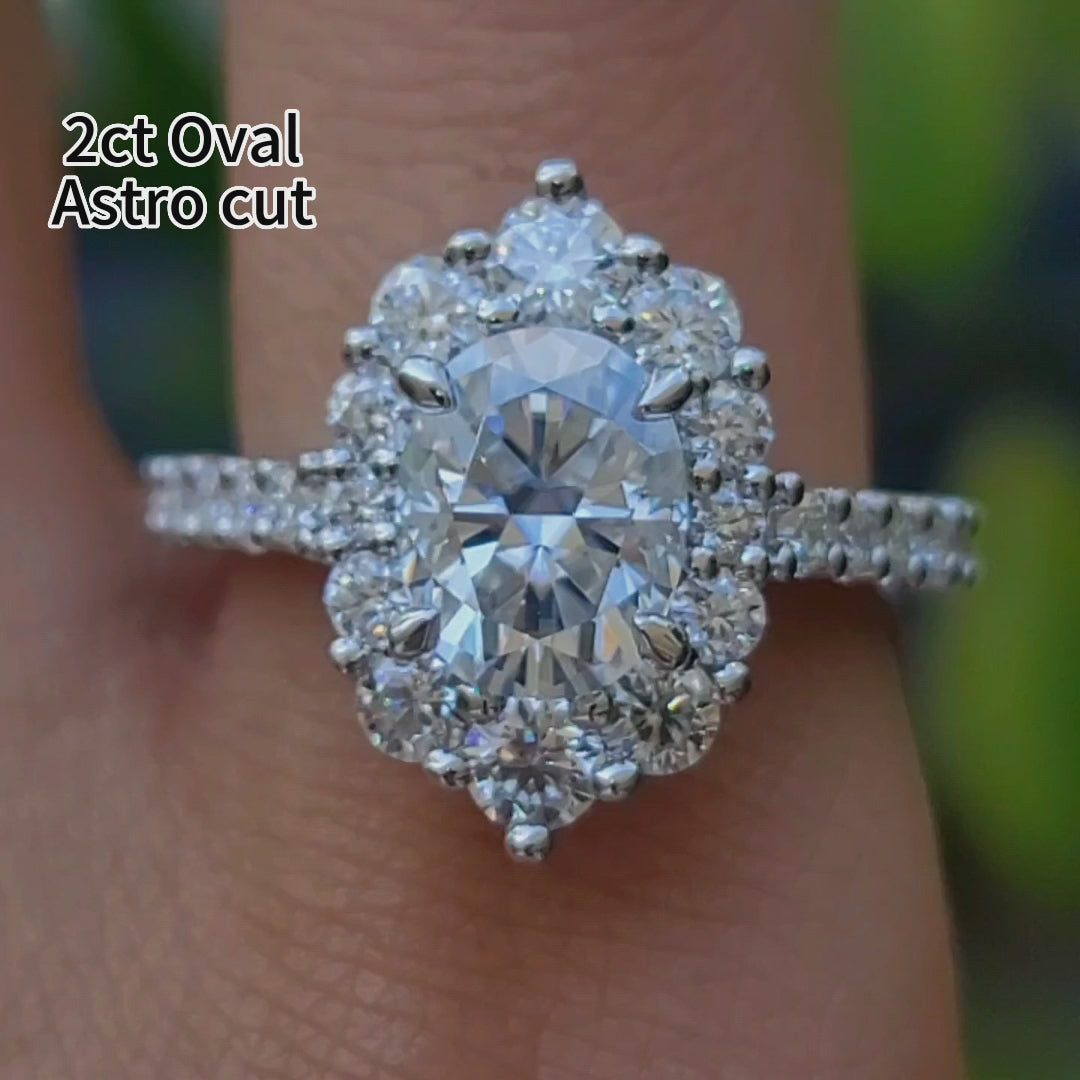 Center stone: 2ct(7*9mm), Oval Astro cut, GHI color moissanite, VS1-VVS1 clarity